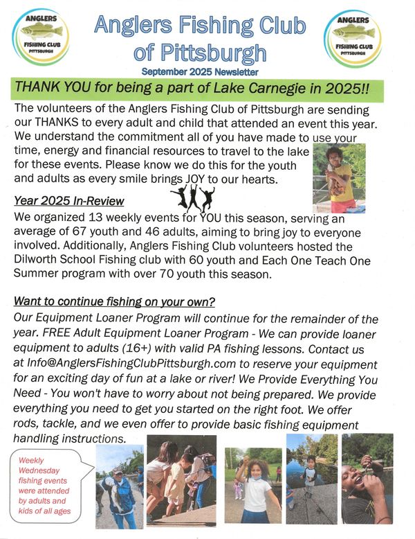 The volunteers of the Anglers Fishing Club of Pittsburgh are sending our THANKS to every adult and child that attended an event this year. We understand the commitment all of you have made to use your time, energy and financial resources to travel to the lakefor these events. Please know we do this for the youth and adults as every smile brings JOY to our hearts.